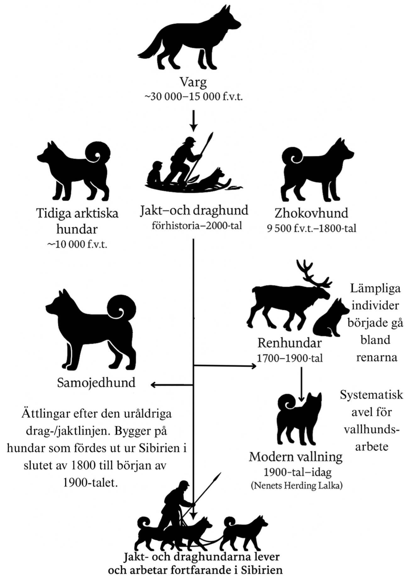 Ovan: Tidslinje över arktiska hundars utveckling: från vargens domesticering (ca 30 000–15 000 f.v.t.), via tidiga arktiska hundar och Zhokovhundar, till de jakt- och draghundar som användes av nordliga folk. Under 1700–1900-talet började särskilt lämpade individer användas bland renarna, vilket ledde till systematisk avel av moderna vallhundstyper (Nenets Herding Laika). Denna valalnde variant är en sidogren ur samma grundtyp av hund som samojedhunden men har utvecklats till en egen hundtyp. Samojedhunden utgår direkt från den uråldriga drag-/jaktlinjen och bygger på hundar som fördes ut ur Sibirien i slutet av 1800-talet. Traditionella jakt- och draghundar används fortfarande i Sibirien.