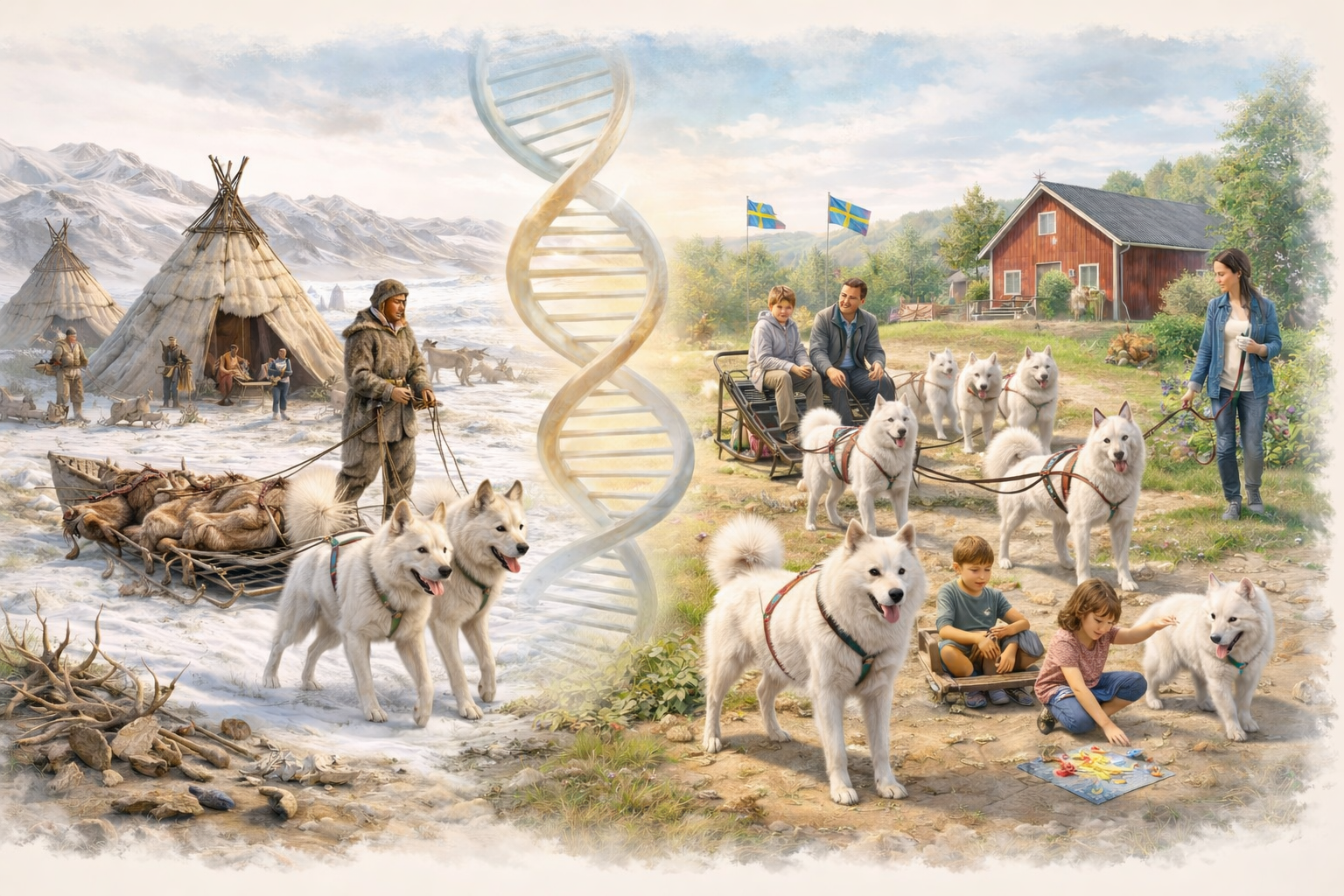 För arktiska hundar är en nyckelstudie Sinding et al., som visar att en arktiskt anpassad hundlinje etableras vid övergången Pleistocen–Holocen (Sinding et al., 2020). Till detta kommer den välkända Taimyr-vargen (ca 35 000 år), där analyser indikerar genetiska signaler av äldre vargintrogression i vissa hög-latitud-linjer (Skoglund et al., 2015; Sinding et al., 2020). Poängen här är inte att "samojeden är varg" (det är en missvisande förenkling), utan att arktiska hundlinjer kan bära spår av mycket gamla populationella kontakter – något som stärker bilden av en lång, regional historia.